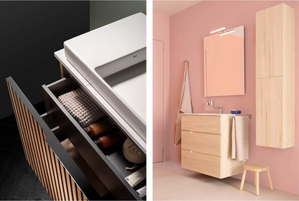 Above left: Roca’s Horizon vanity features a hidden drawer inside the main drawer, from £1,929; Above right: Victoria-N 800mm wall-hung vanity in Light Ash, £993, and matching Extra column unit, £456.