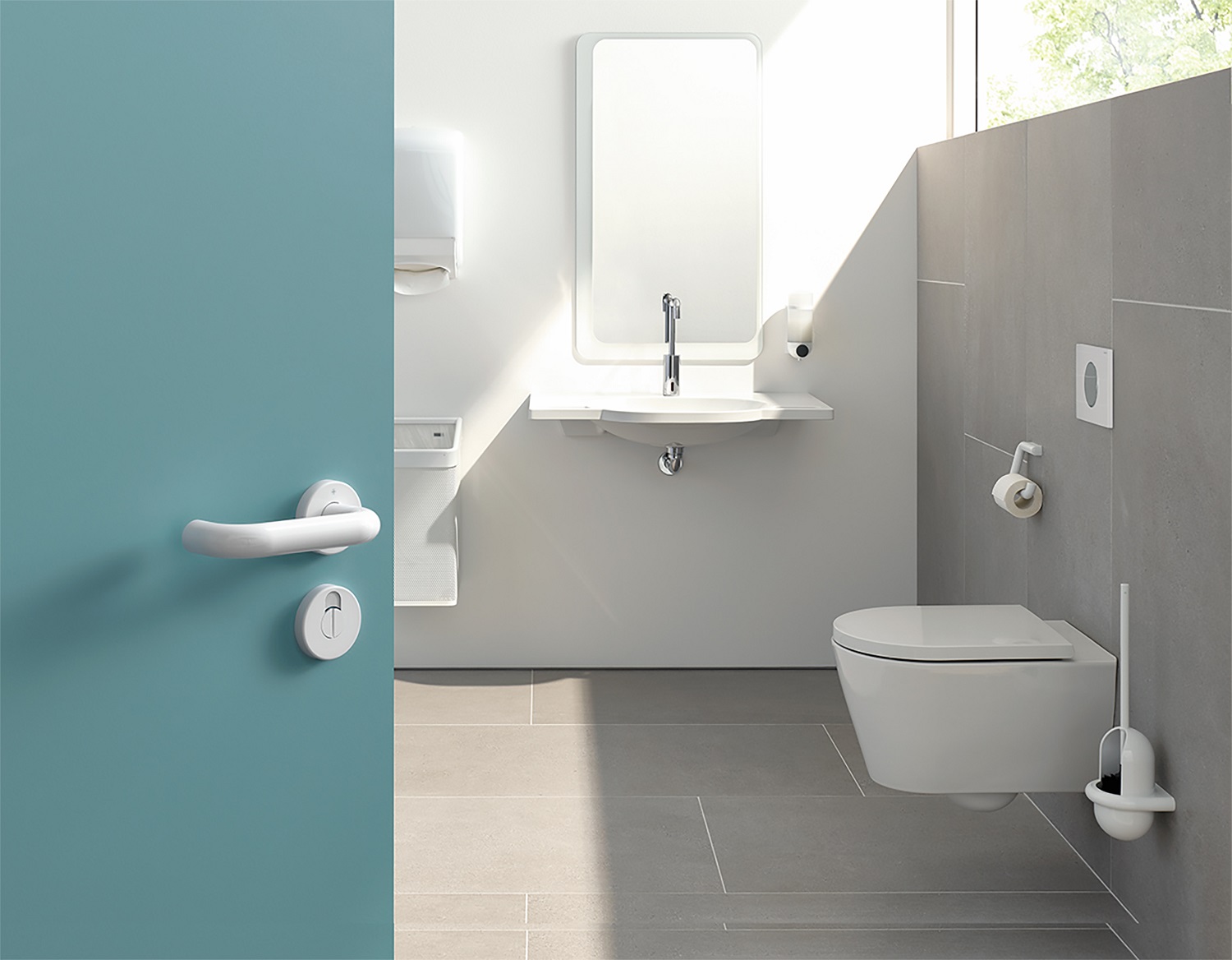 A comprehensive range of lever handles, sanitary accessories and care products is available in the classic round tube design in the colour signal white.