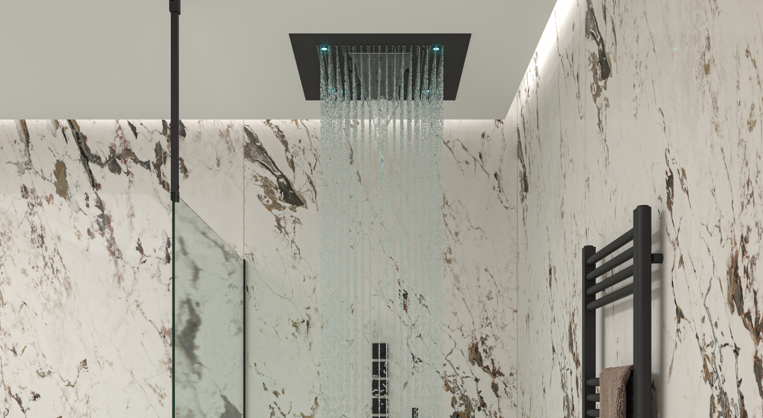 This recessed shower head features four functions: waterfall, spray, rain curtain, and rain, as well as RGB LED lights. It measures 600 x 600mm and requires a minimum operating pressure of 1.5 bar for an indulgent showering experience that promotes wellness.