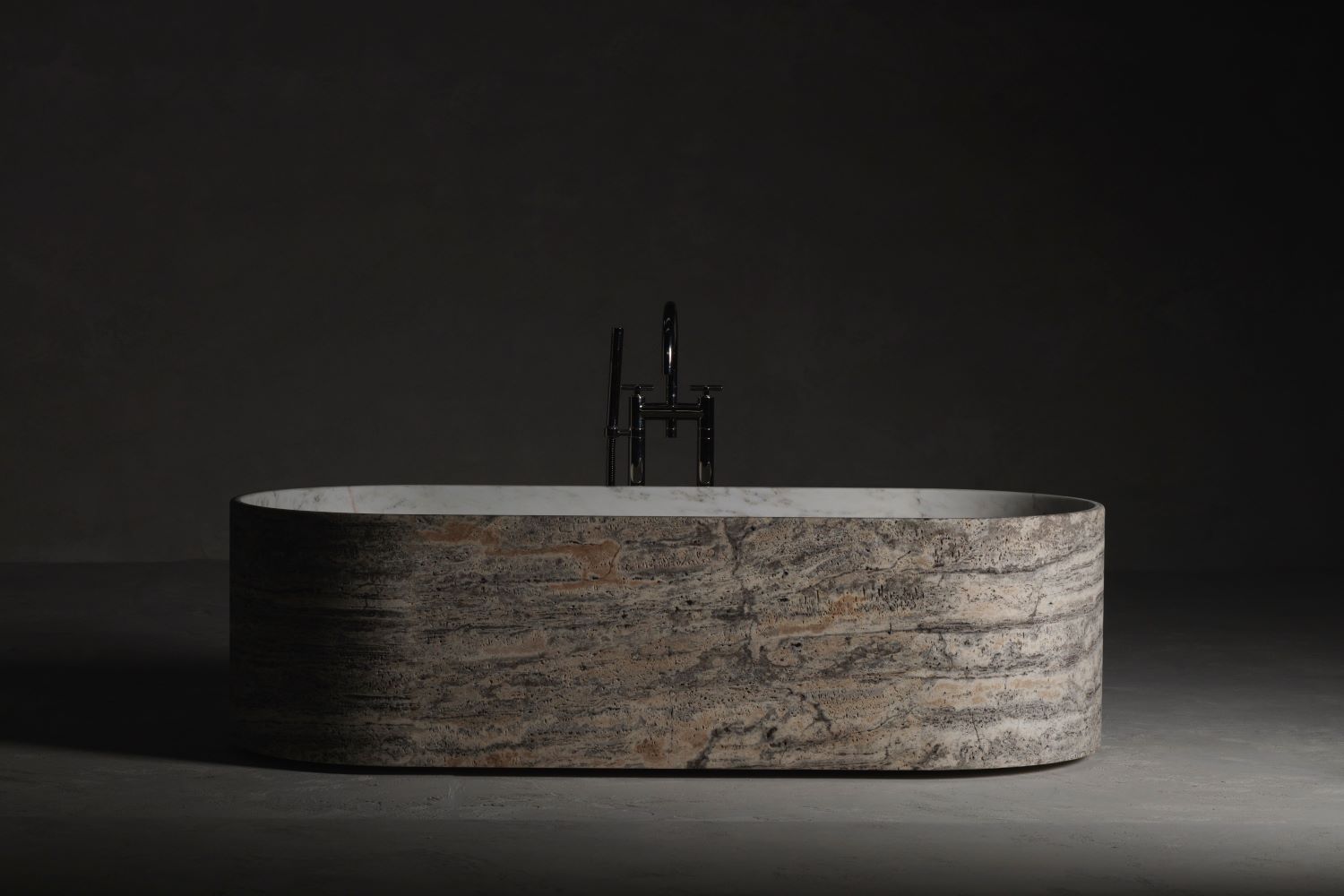The result is an elegant antithesis, not only in colour but also in the texture of the natural stone, with different veins and nuances meeting at the top edge, crafted to achieve a minimal and striking thickness. Bianco Carrara and Bianco del Re are the options dedicated to the internal silhouette of the tub, while the exterior can be customized in a wide range of marbles, travertines, and semi-precious stones.