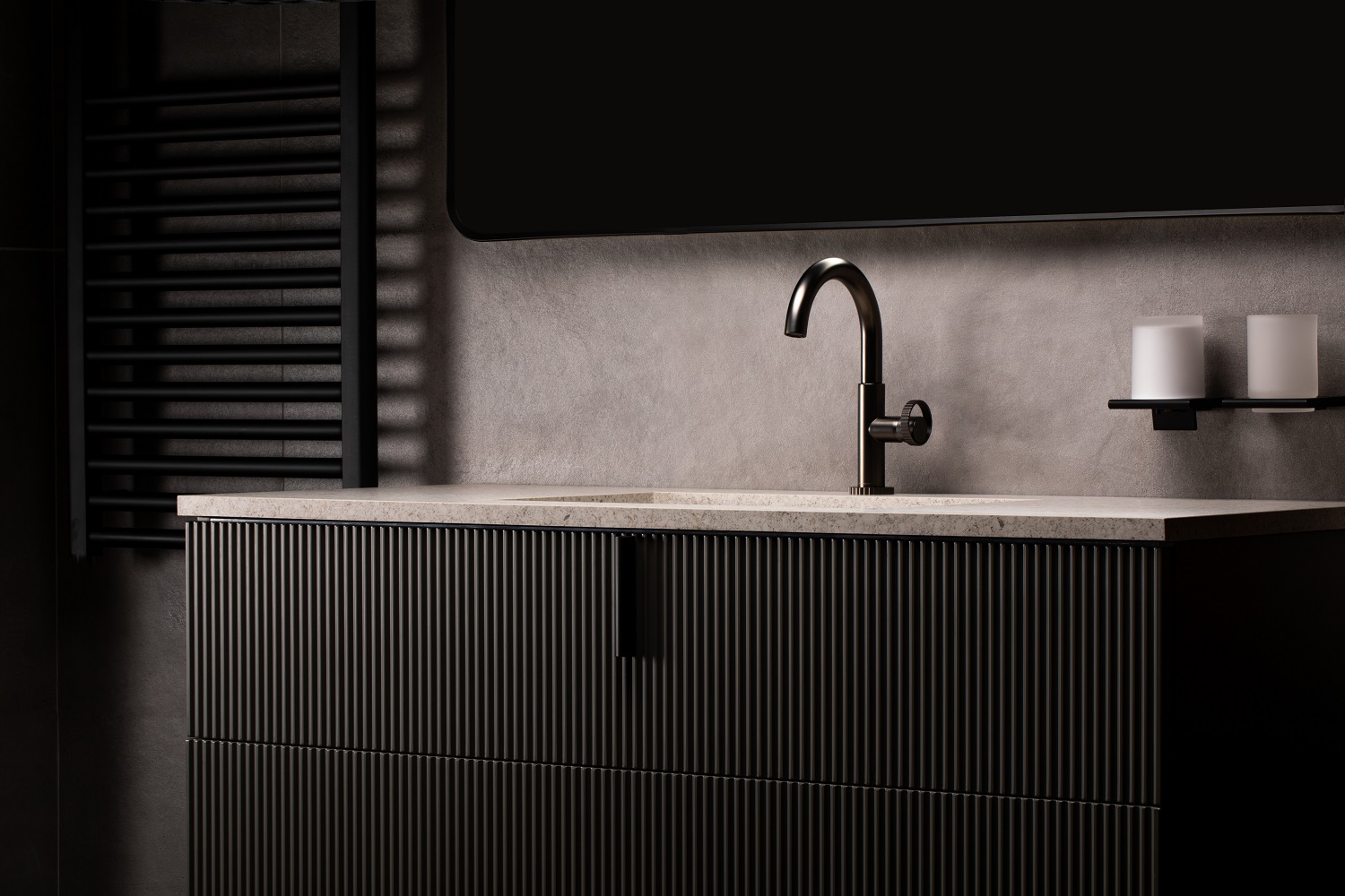 The furniture unit can also be combined with a countertop in a choice of surface options, including Statuario Polished, Light Grey, Terrazzo White and Capraia Matt. This can be provided as a slab countertop or as an integrated slab washbasin for a seamless finish with no joins for complete hygiene and a hotel-inspired look. If preferred, the design of the furniture can be elevated even further with the inclusion of an integrated glass washbasin in striking Graphite.
