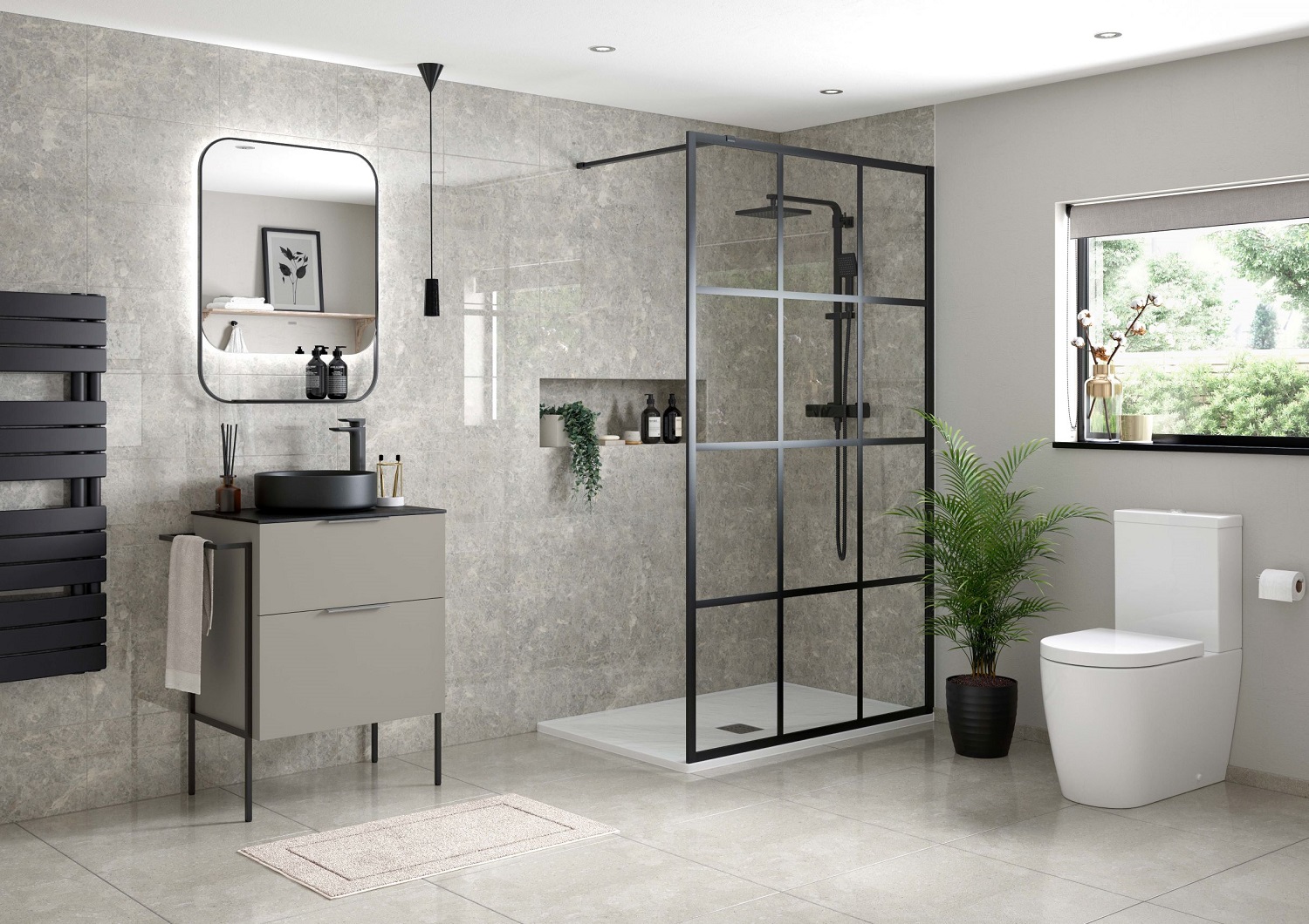 Luxurious and eye-catching, the new floor-standing range will help make a bold ‘statement’ in any bathroom, and the on-trend matt black frame is a good choice for industrial styled or monochromatic bathroom interiors. As pictured above the matt finish is themed throughout, with matt black framed RefleXion wetroom panel, matt black shower and basin mixer, Urban Black basin laminate, matt black Luxey vessel basin, anthracite radiator and black metal framed Luxxo mirror – all from Bathrooms to Love.