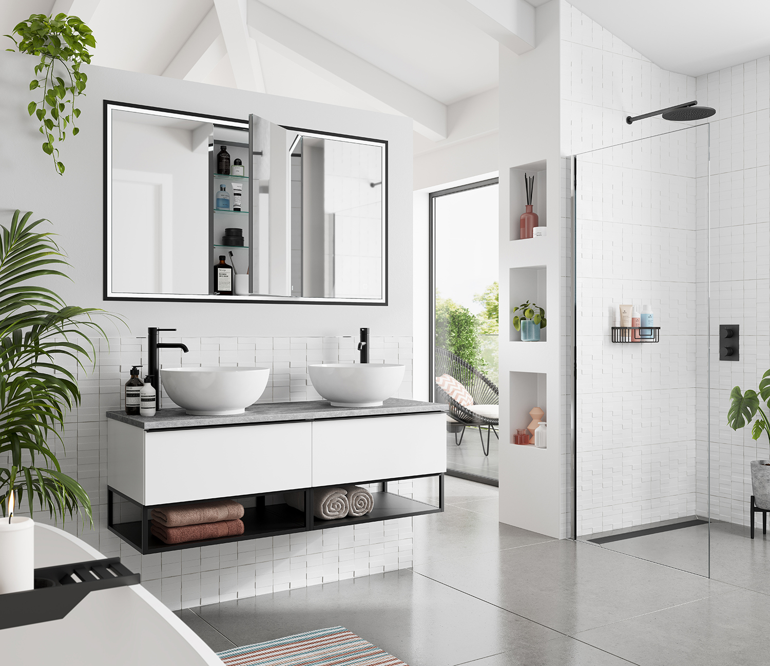 Available in four sizes, 50cm, 60cm, 80cm and 120cm, Vanquish neatly fits within the recess of the wall and provides integrated 2-pin charging points for razors and toothbrushes. Because of the colour changing LED illumination and heated pads to reduce condensation, users can enjoy clean, and clear reflections while in the bathroom.