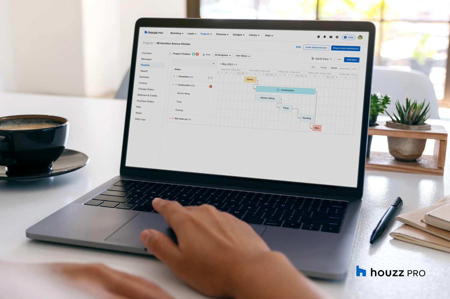 The Houzz Pro Timeline tool enables pros to quickly map out a project schedule, track progress and visually communicate their plan to everyone involved. With easy to create Gantt charts, pros can organise their project and ensure they have the right equipment, materials and personnel on-site.