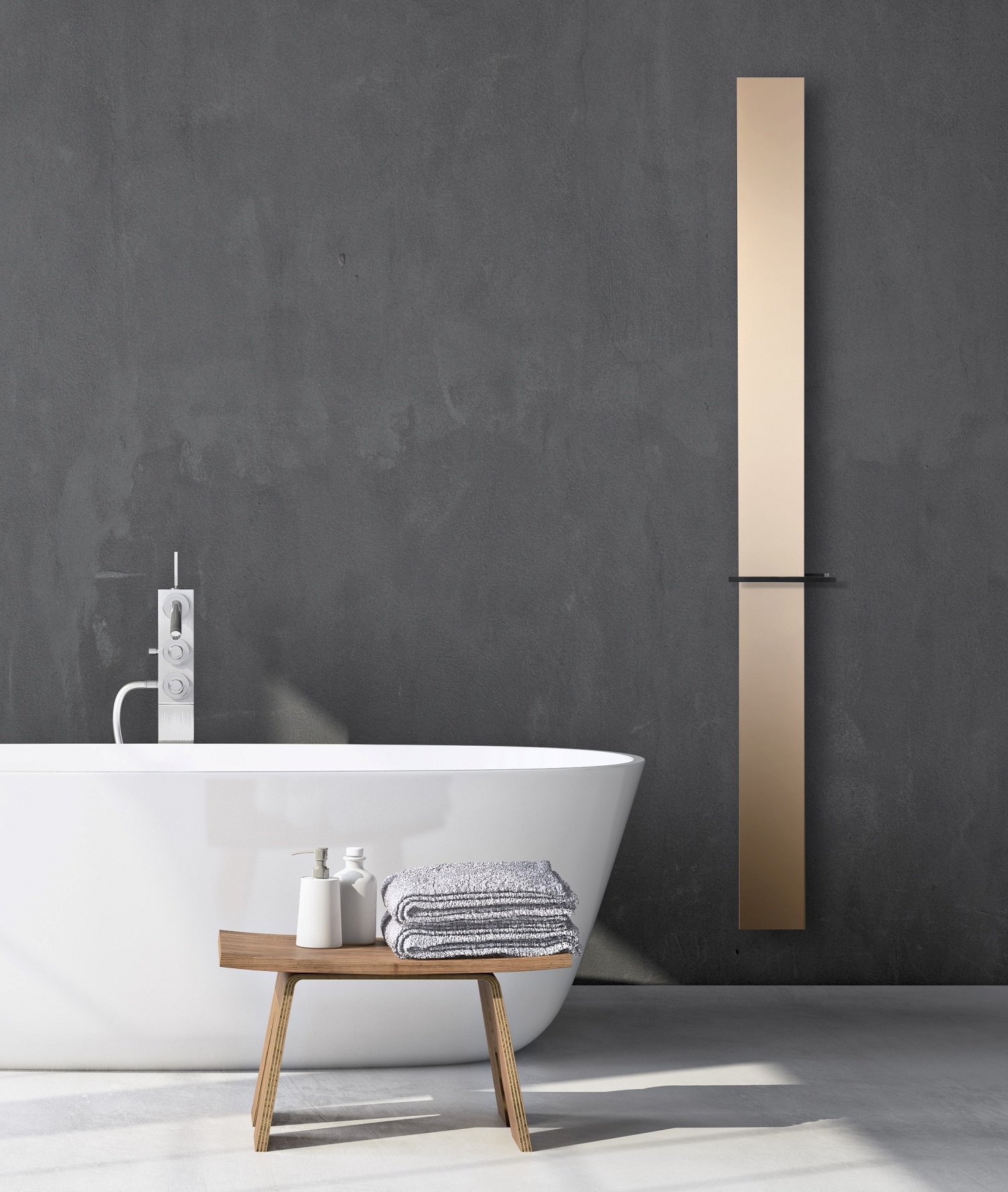 To generate electrical resistance the small profiles of the Beams Mono radiators are fitted with additional fins to increase the heat output. A cover panel is integrated at the back, in the same colour as the front, where the electrical resistance is entirely hidden from view. As a result the radiator can be heated to high temperatures, naturally with the option of automatically regulating the surface temperature according to your needs.