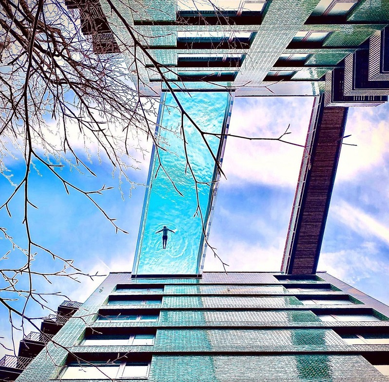 However, if all the baths in both towers were filled with water they would not come close to filling the Sky Pool; which at 82 feet long, with 46 of those suspended in mid-air, it is longer than most Olympic sized pools which when full contain over 2.5 million litres of water.