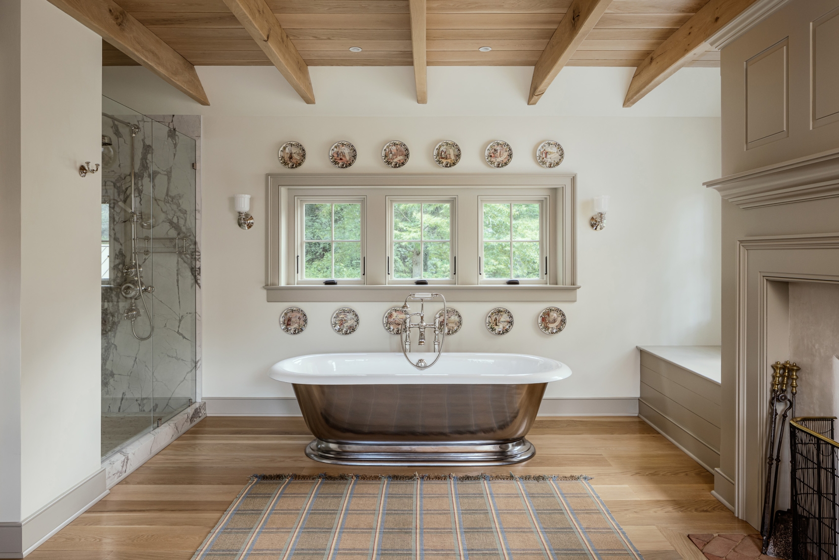 In collaboration with Joe Hammes of Red Oak Restorations, careful attention was paid to the proportions and layout of the extension. Material choices were equally thoughtful, with White Oak used for both ceiling and flooring, harmonising with the original structure. An antique Pennsylvania Day Bed was sourced, echoing William Morris’s Arts and Crafts movement, and placed before the fireplace to enhance the room’s rustic character. Plates depicting Richard Wagner opera scenes were also incorporated, adding personal flair – a nod to the owner’s passion for theatre. These were originally purchased from the Bayreuth Festival’s gift shop in the late 19th century.