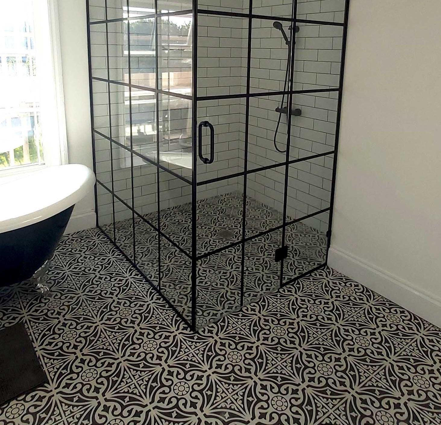 The metal-framed glazing gives the bathroom a contemporary feel, adding a hint of industrial style by taking a standard clear glass shower enclosure or screen and adding this important detail with ease.