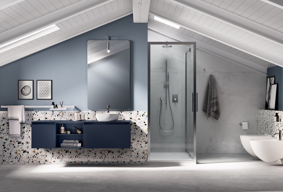 In addition to colour, Scavolini’s Miko collection brings texture to the bathroom with a slatted door, offered in gloss or matt lacquers, and laminates. These tactile finishes provide a pleasing contrast to the smooth ceramics in the bathroom, adding a sense of warmth, especially when chosen in a wood-effect finish. Also of note is the easy-to-open grip handle, which is available with a profile in a white, black or metallic finish (including Brass, Silver, Bronze and Titanium).
