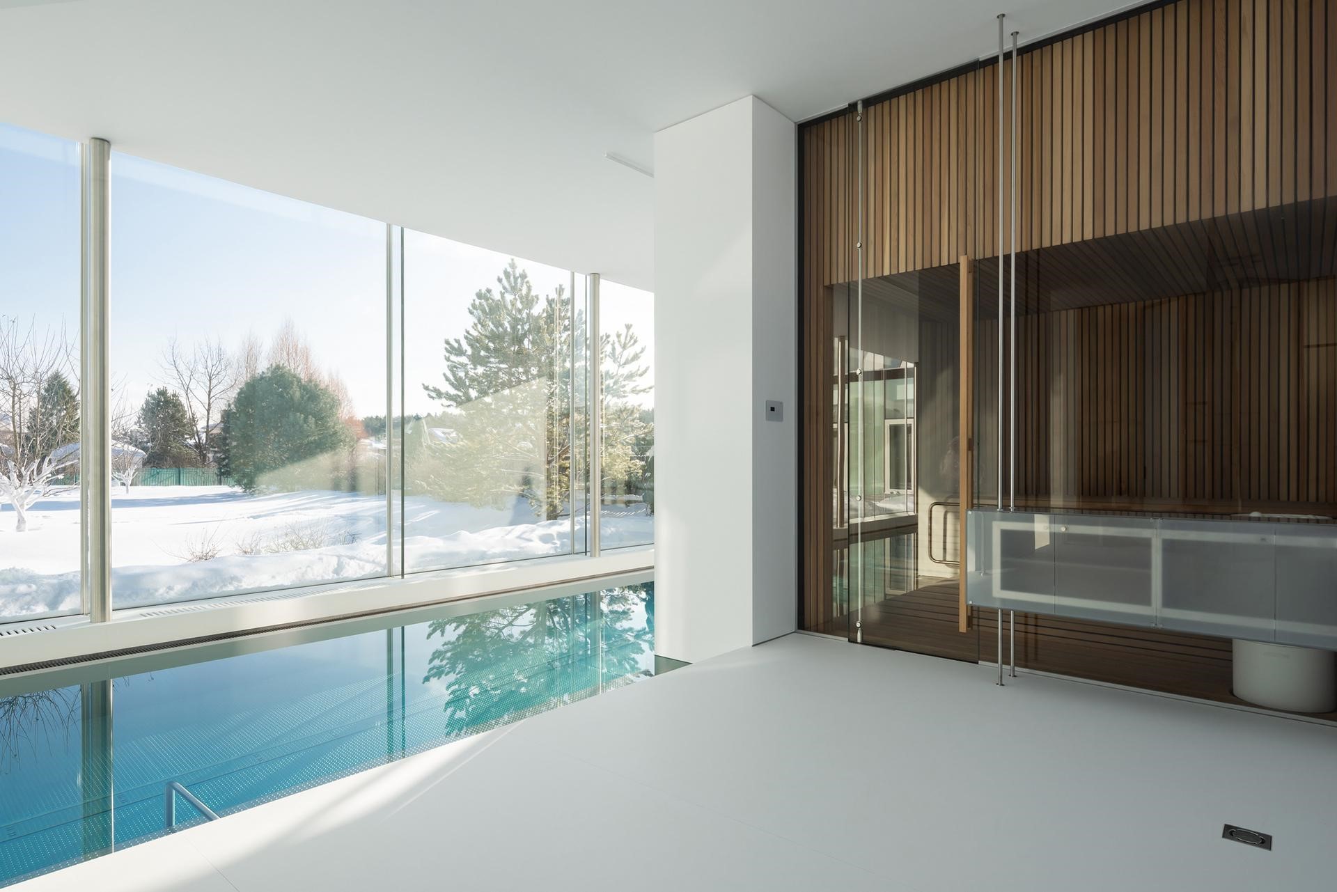 A few years after the completion of a residential building designed by the famous architecture firm Tsimailo Lyashenko and Partners, the architects of Blockstudio – led by the two siblings Natalia and Ivan Trofimov – have put their stamp on a nearby pavilion, commissioned by the same owner and dedicated to housing a swimming pool area with some spa facilities.