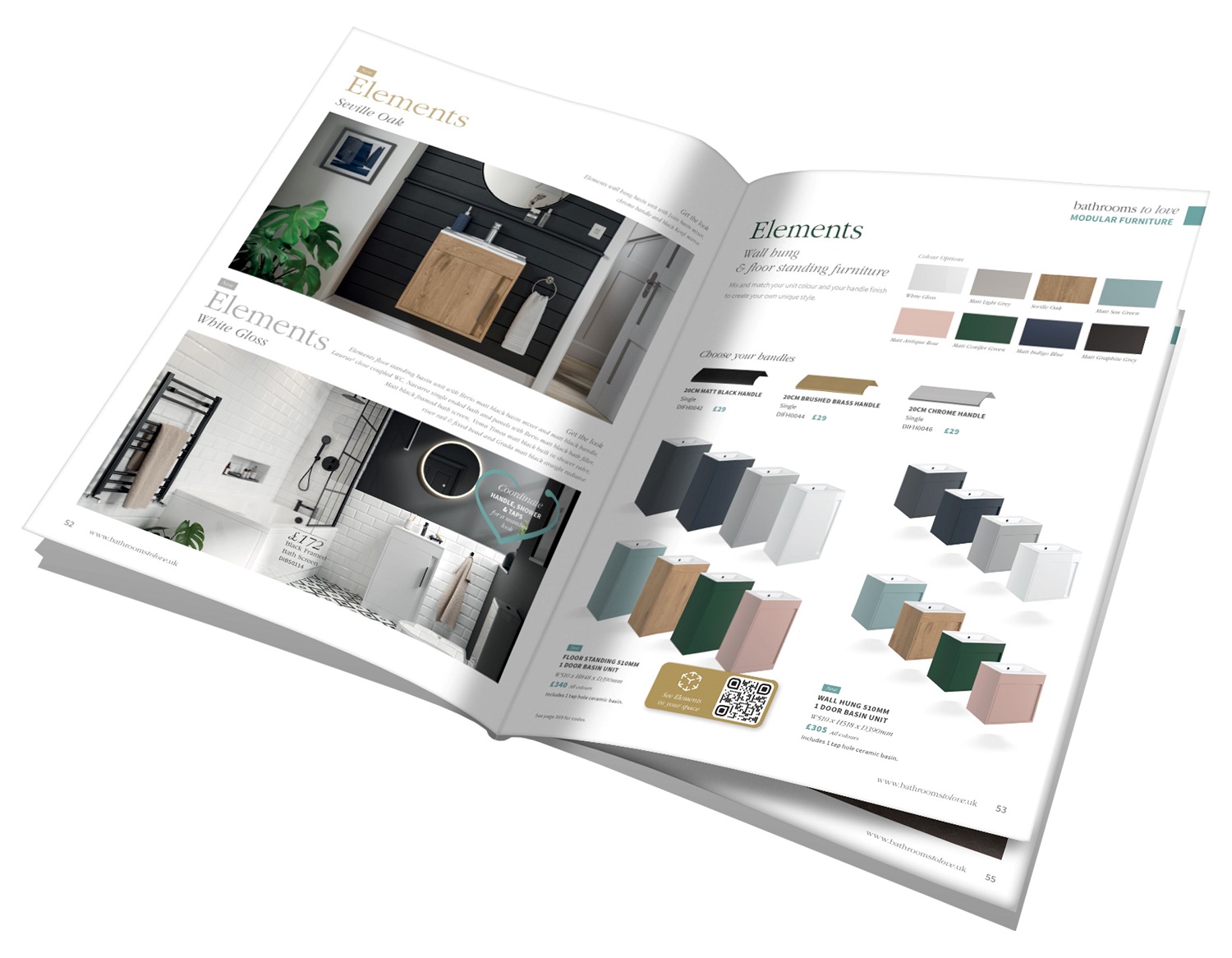 Taking prime spot on the brochure’s front cover is a new premium design, ‘Texture’, an elegant, fitted bathroom furniture range boasting an ultra-modern fluted finish, available in Graphite Grey or Matt White. In fact, colour and texture play a big role in this season’s Bathrooms to Love furniture launches, with some beautiful new shades introduced across both fitted and modular. From a Matt Deep Blue in the ‘Statement’ range, to Matt Sage Green in ‘Benita’ and ‘Lambra’, as well as a whole colour palette of shades in the new ‘Elements’ family – Antique Rose, Conifer Green, Sea Green and Indigo Blue, to name just a few. And with more handle choices available, in finishes such as brushed brass and matt black, design options are very flexible.