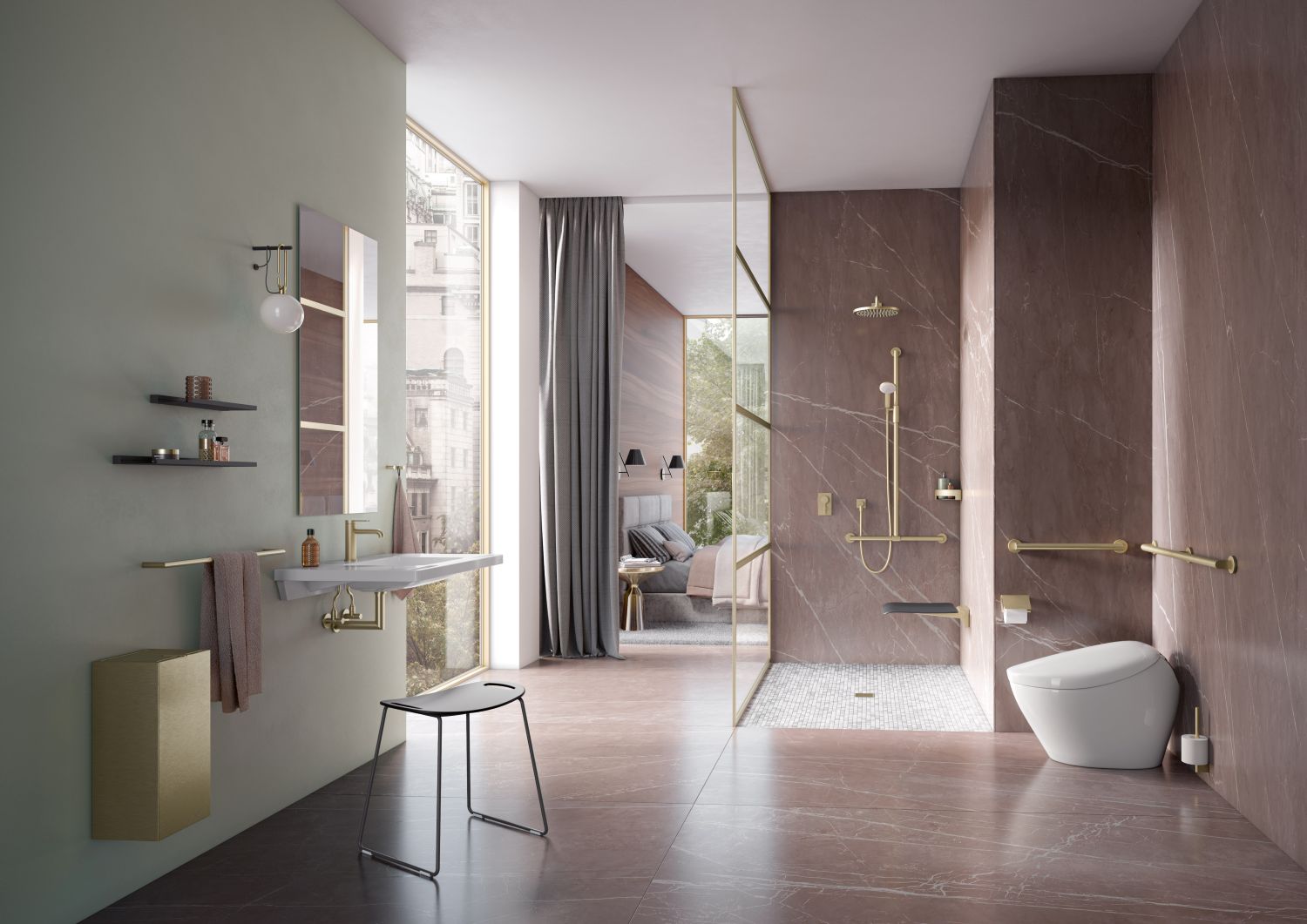 Delivering more glamour to the bathroom, HEWI adds new metallic designer surfaces, including options such as brass, bronze or gold. The latest designs can help transform contemporary sanitary rooms into personalised oases of well-being – be it in hotels, representative public buildings, elective surgery areas in hospitals or the bathroom at home.