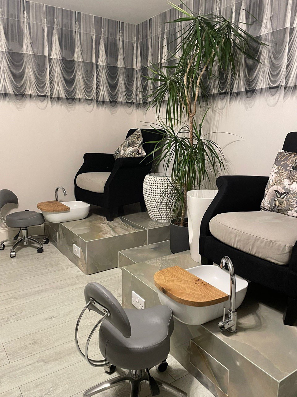 Adam McEwan of Sussex Wetrooms explains, “We were tasked with designing and building these beautiful pedicure thrones for a treatment room. They not only needed to be aesthetically pleasing but also functional so that the technicians could work at a comfortable height whilst having space for their equipment. We created a solid timber framework clad in marine ply then covered it with Schlüter-DITRA and Schlüter-KERDI-200 waterproofing membrane; it was all then finished with a large-format, green onyx porcelain tile.  All external edges were mitred and finished with a gloss resin colour-matched to suit the tile.  Along with installing the basins and mixer taps, we also the Schlüter-REMA system to create a concealed access panel to ensure the taps and basin wastes were accessible for servicing in the future.”